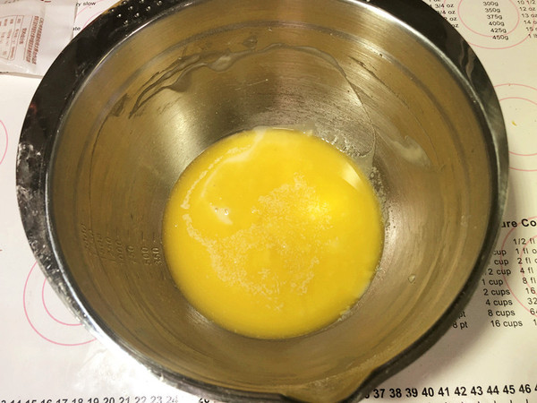 鸡蛋和糖粉放在打蛋盆里,用手动打蛋器搅打均匀