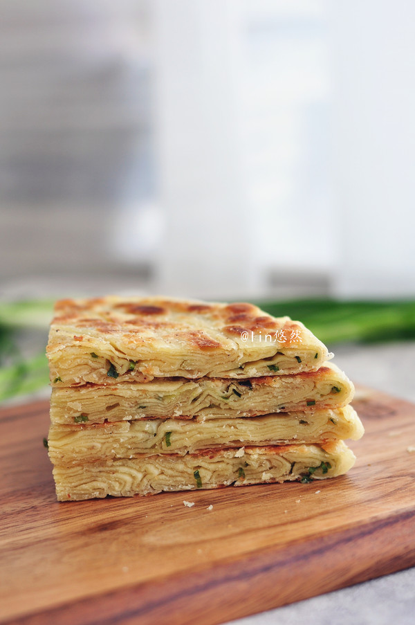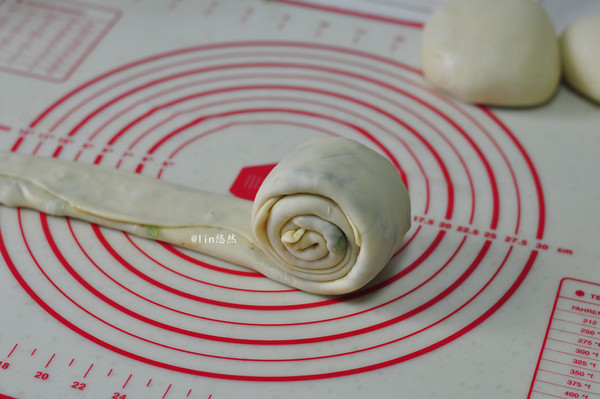 面团分割成三份,取一份擀开成长方形的薄面片,均匀的抹上油酥,撒上葱花。