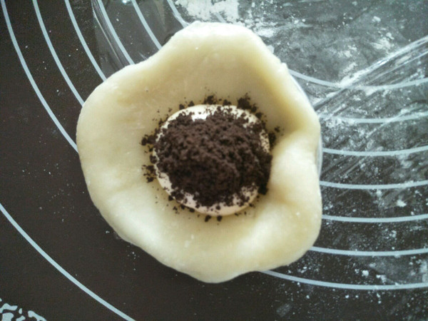将面皮放入一蛋挞模中,中间挤入奶油。