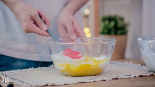 蛋黄和蛋清分离开,分别用干净无油无水的搅拌碗装盛。