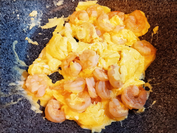 在很小的火下,将鸡蛋和虾仁都炒熟,准备出锅