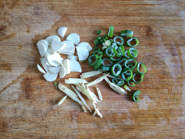 葱切葱花,蒜切片,姜切丝,青红椒切圈。
