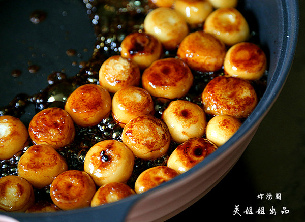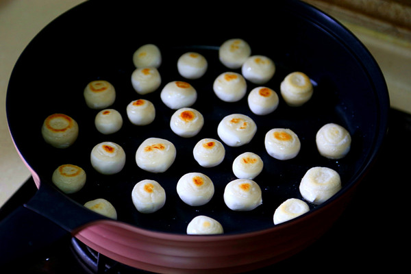 不粘平底锅内刷一层层薄薄的油 ,搓好的糯米球一个个摆进去,小火慢慢煎