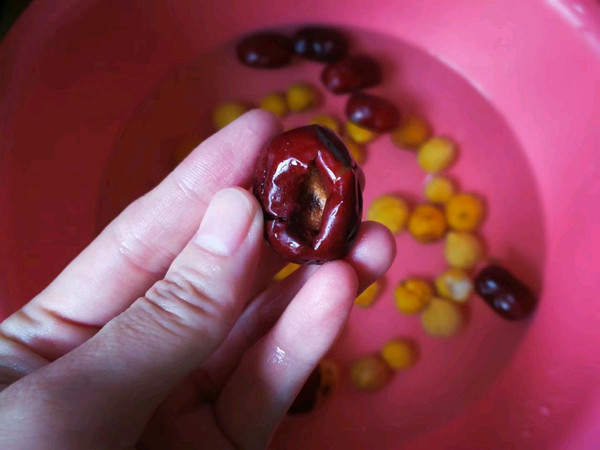 将红枣用手戳个小洞,这样煲汤时里面的营养物质很容易融合到汤里。