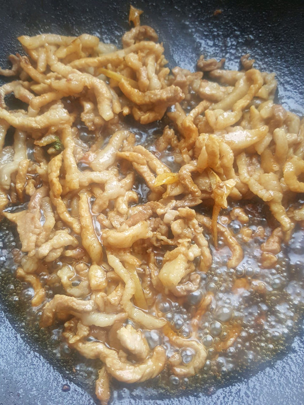 肉丝炒至变色。