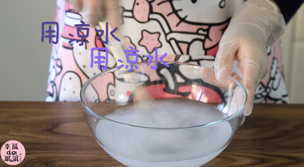 发酵的时候准备碱水。烘焙碱倒入冷水中拌匀。我是拌匀后就用个盖子盖起来了,我怕我家猫咪会过来闻,家里有小朋友小动物的都要注意,不要让他们接触到。