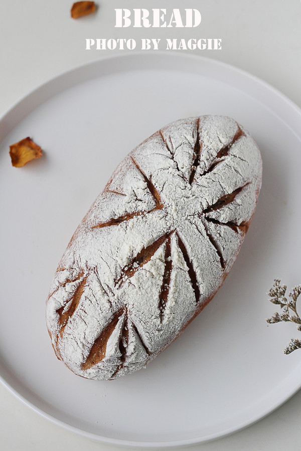 15.二发完成后,在面包胚上撒高粉,用割刀在面包胚上划出纹路