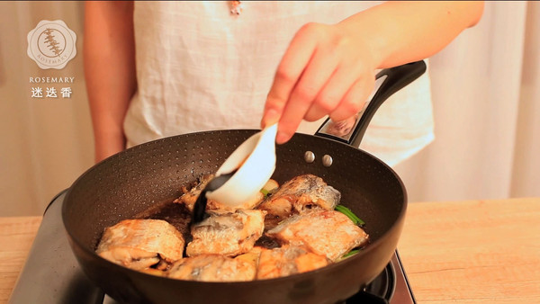 接着放入刚刚煎好的带鱼,倒入生抽、老抽、糖、醋、八角