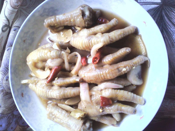 将鸡爪洗净去爪尖,凉水下锅小火煮30分钟左右,捞出入冰水中过凉冷却。洋葱洗净,切片;干红辣椒斩成两段备用。