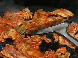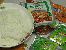 食材:韩国泡菜.香肠.萝卜干.米饭。
