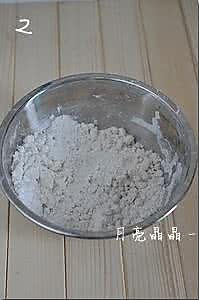 糯米粉、大米粉(粘米粉)和细砂糖拌匀后,平均分成两份。取其中一份加水130ml左右,搅拌成半干半湿的原味粉,搓散。