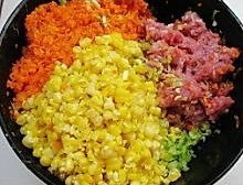 瘦肉剁碎,玉米切粒,胡萝卜也多碎,还有葱姜。这营养老丰富了。拌上油盐酱油,馅香喷喷的。