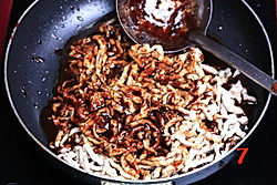 等酱汁开始变粘时,将肉丝放入,不停地炒动,使甜面酱均匀地沾在肉丝上。
