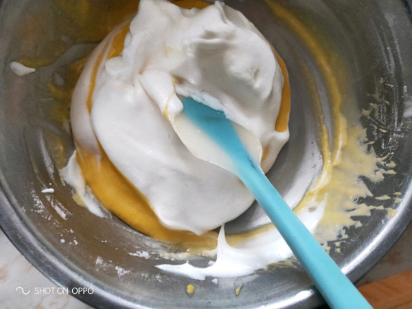 在把翻拌好的蛋黄糊都到入蛋白糊里