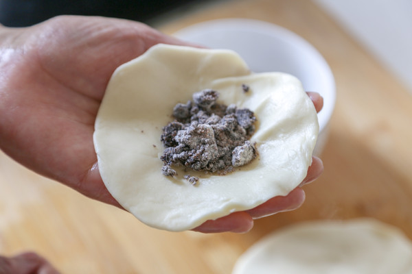 将醒发好的面团分成若干个大小合适的剂子,并用擀面杖擀平