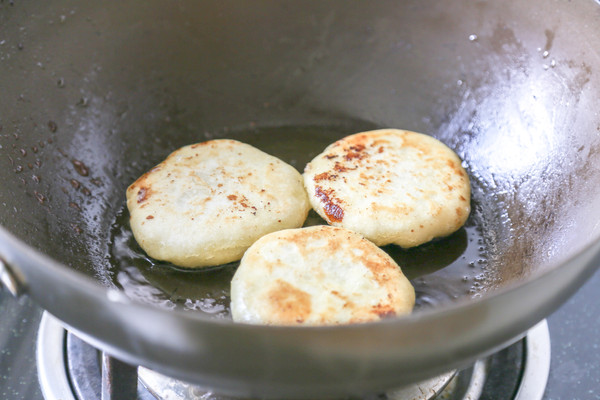 锅中油烧开后,放入红糖饼,小火煎5分钟左右