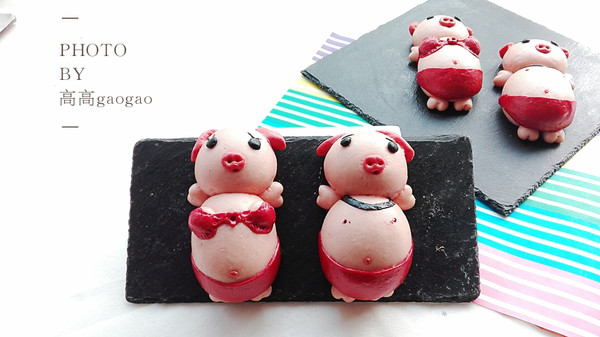 最后剩下的黑色面团,同样用擀面杖将其擀成一个薄片,分别做出小猪的眼睛、眼眉等,如图所示,这样小猪 就做好了。