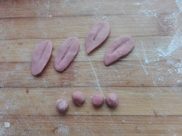 继续来制作耳朵及嘴的部分,分别用秒微笑深一点的粉色面团,取其约1.2克小面团来整理出耳朵的形状,还有准备好4个约为0.3克左右的小面团用来做嘴巴。