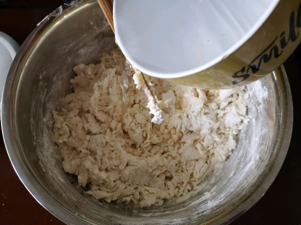 先用少许温水将酵母化开倒入面粉中,接着温水慢慢加入面粉中,搅成絮状,水要留20克,看状态再添加。