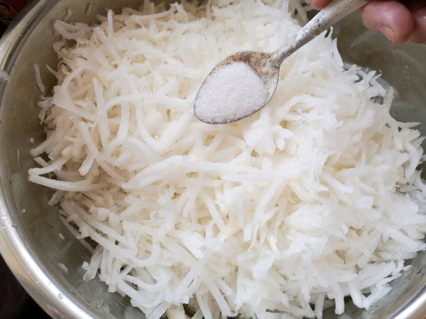 面团发酵期间开始刨萝卜丝,放入半勺盐腌制出水。