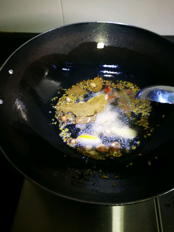 油锅预热,小火下姜片爆香,再下除了干辣椒以外的其它香料,豆瓣酱和火锅底料一起炒匀,立即紧随其后下羊蝎子翻炒。