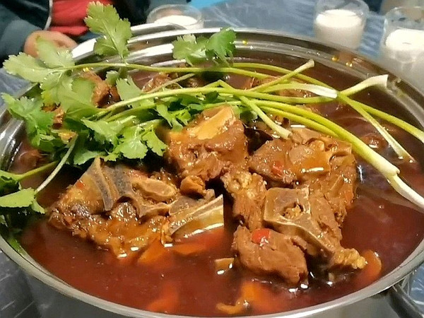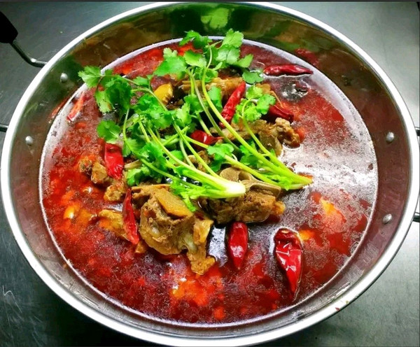 烧好后倒入汤锅中。汤锅底部可放萝卜或山药块,汤上面放上干辣椒和香菜就可以上桌用用小炉子煮着,边煮边吃不会冷,可以先啃肉了,后面随时烫入自己喜欢的蔬菜,边涮边吃,不亦乐乎。