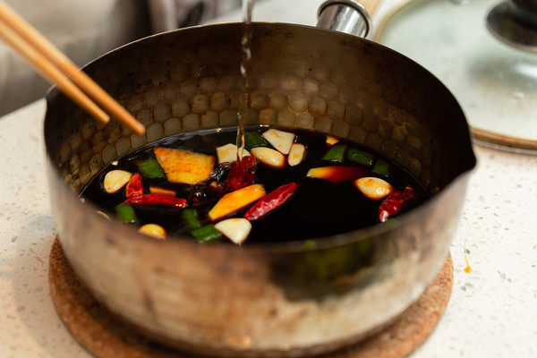 当酱汁还有一点点余温时,加入少许蜂蜜,搅拌均匀,待酱汁完全冷却后,加入姜片,蒜,干辣椒,小尖椒,以及少许白酒,搅拌均匀。