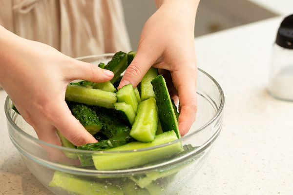 新鲜黄瓜洗净后切成小条状,放入大碗里,撒上适量盐,用手均匀揉搓。