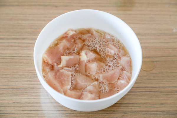 将鸡肉丁放入蛋清中,加少许黑胡椒粉和盐,抓匀后腌制15分钟