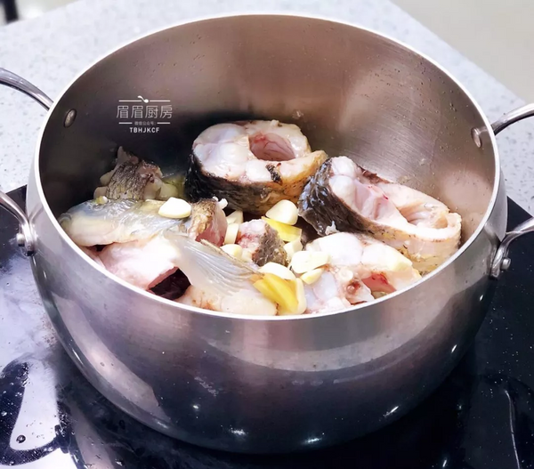 多用锅800瓦预热后加入植物油至产生油纹,放入姜片和大蒜炒香后,捞出备用,再放入处理好的草鱼,煎至表皮焦黄酥脆