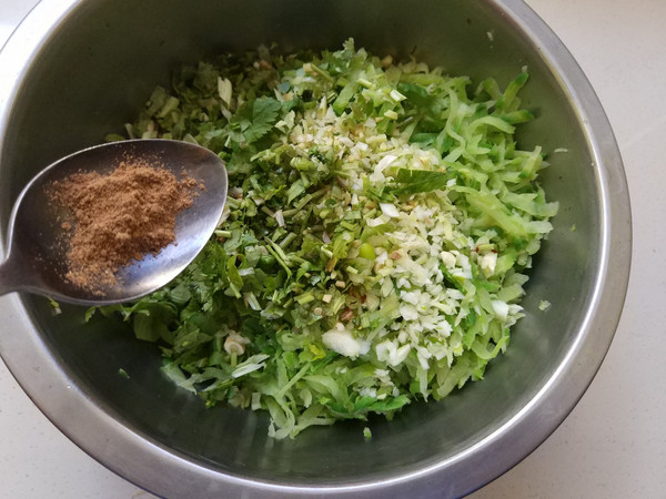 萝卜丝攥去水分,放入葱姜、香菜末、五香粉、盐拌匀。