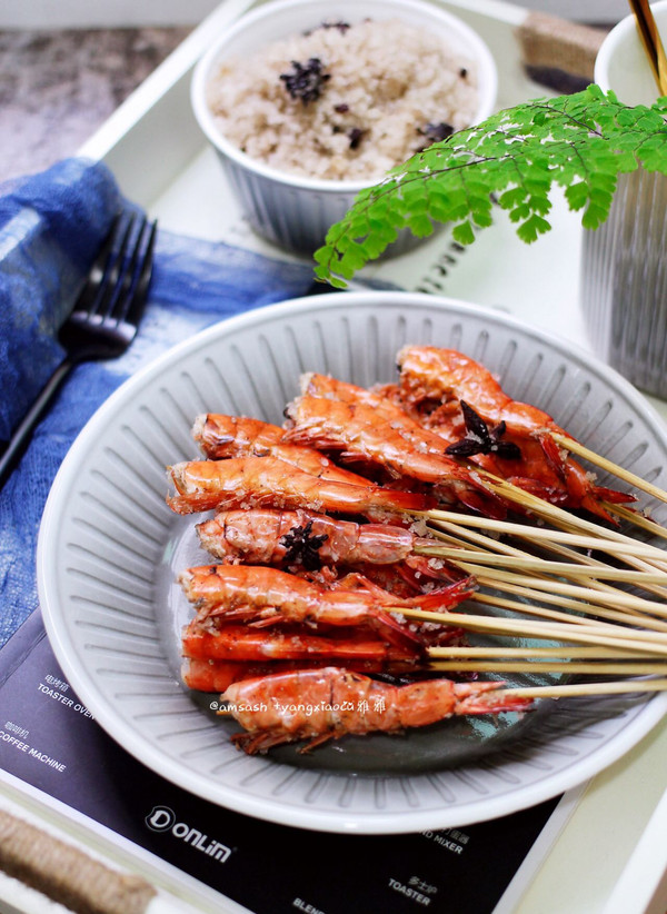 然后用竹签把虾多虾的尾部开始,把虾逐一串好