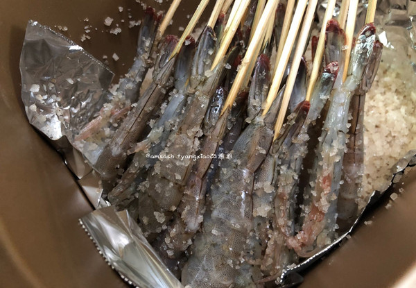 把混合好的一半海盐倒入面包机桶中,然后把串好的虾也摆入面包机中,如果竹有点长可以剪短点,这样子后面面包机的盖子才可以盖得上