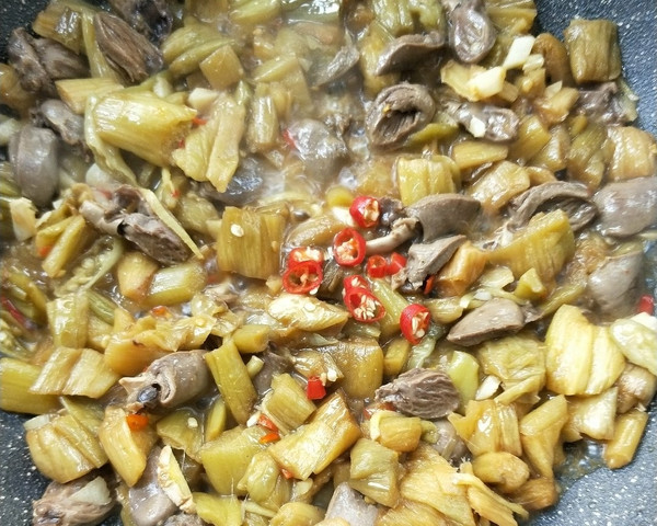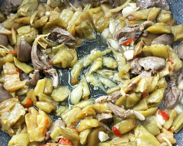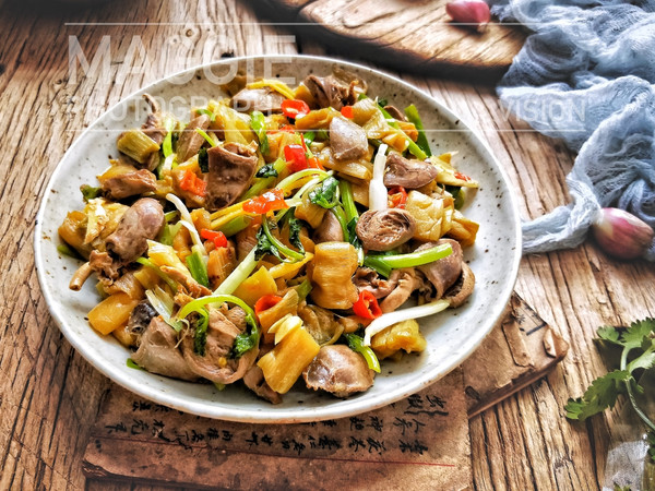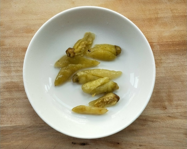 鸡心洗净,撕去油脂,对半切开,洗净污血。