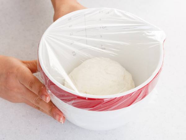 取出加入 KitchenAid 陶瓷烤碗加盖保鲜膜发酵12小时左右。