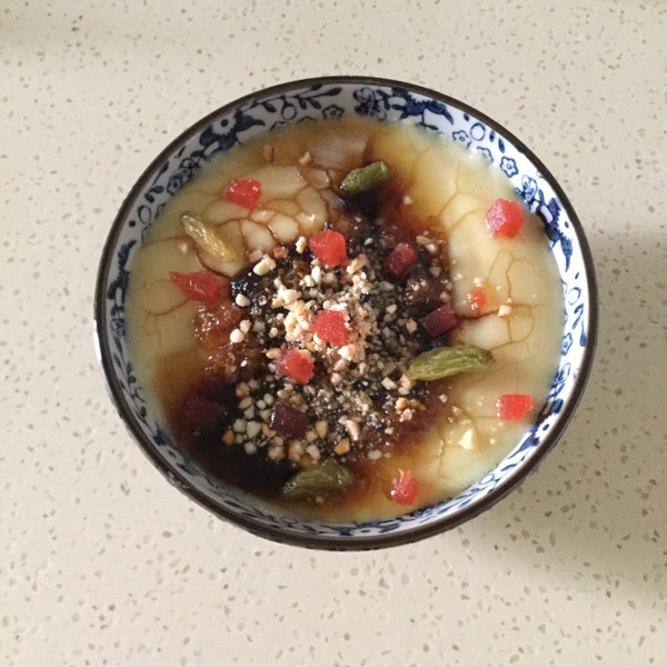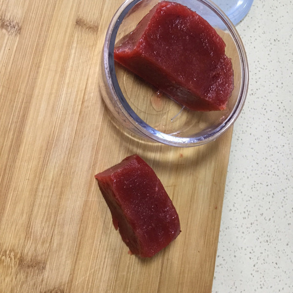 准备好山楂糕,这个也是自己做的,用山楂清水,搅拌机搅拌成糊,加干桂花加糖熬煮粘稠,倒入碗里定型,吃不完可以冻起来。