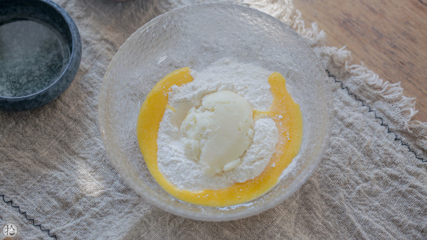 把一半蛋液倒入60g低筋面粉中,加入山药泥。 低筋面粉可以让口感更加绵软适口,如果对口感没有太高要求,用中筋面粉(普通面粉)也是可以的。