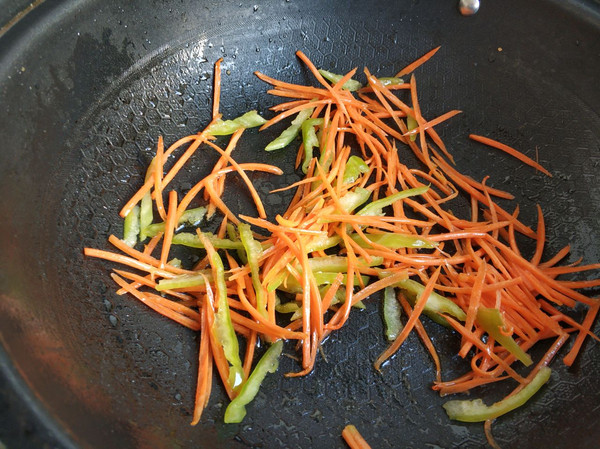 锅中余油,爆香蒜末,下入胡萝卜丝、尖椒丝翻炒几下。