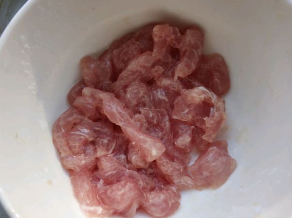 肉丝切好,加盐、料酒、胡椒粉、淀粉抓匀。腌制10分钟。