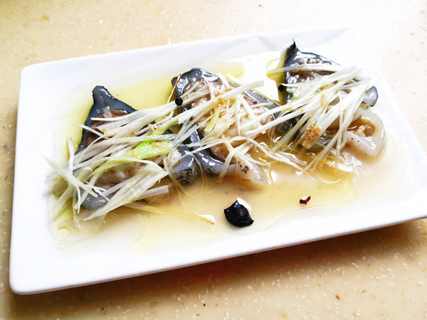 7. 蒸好后取出来,去掉姜丝,摆上葱丝,撒上少许白胡椒粉,