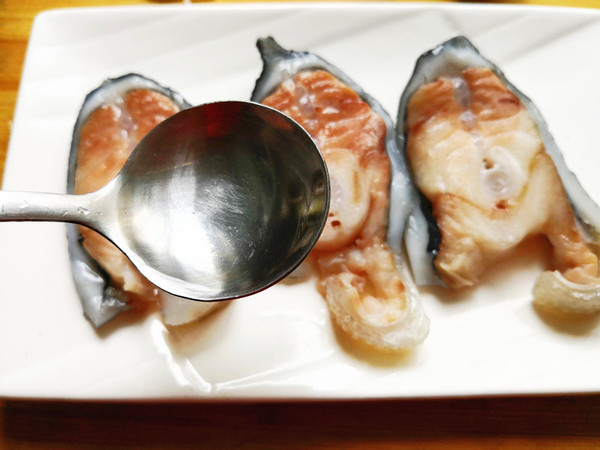 4. 将海参斑取出摆在盘子里,腌制的汤汁倒掉,重新再倒入一勺料酒,