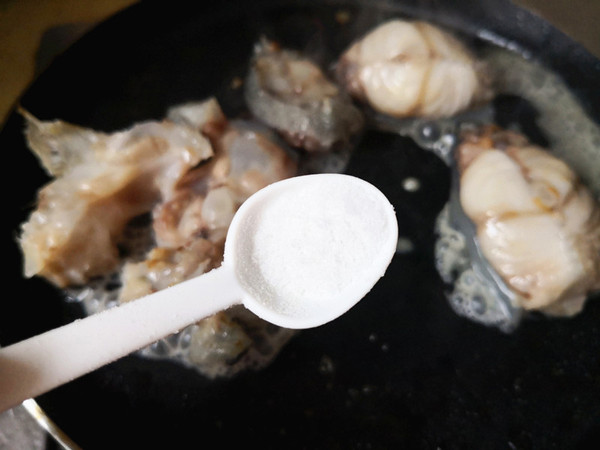 4. 煎至鱼定型后,将少许食盐均匀地撒在鱼片的两面,