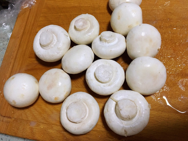 去掉口蘑的蒂(不要丢掉哦,可以一起进烤箱烤,味道也很不错的)。