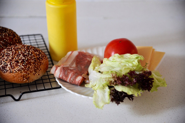 一次摆上生菜 西红柿 肉饼 培根片