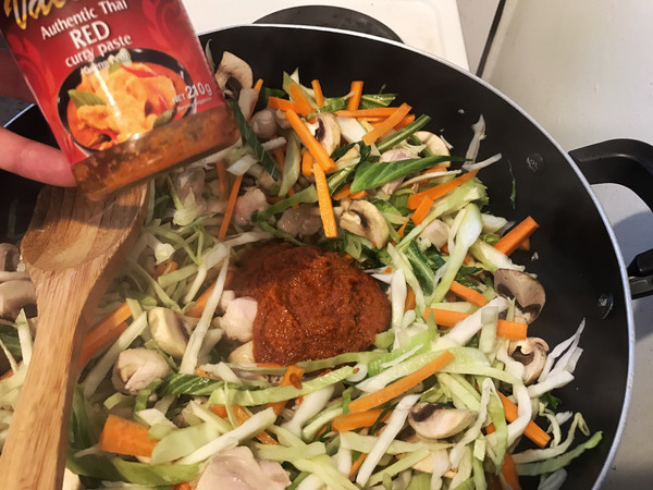 倒入红咖喱酱继续煸炒、直至锅内所有食材着色均匀
