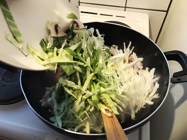再将卷心菜、胡萝卜和蘑菇放入一起煸炒直到变软大约3-5分钟