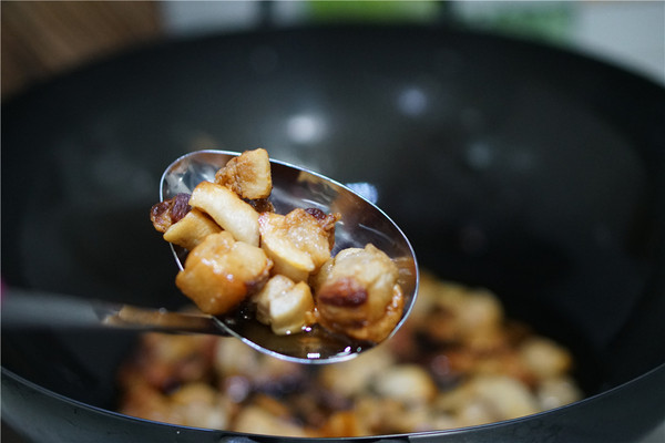 然后转小火将肥猪肉块下锅,先小火略熬一下。