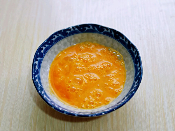 起油锅,倒入打散的蛋液,小火煎鸡蛋饼,再用铲子铲碎,盛出备用。