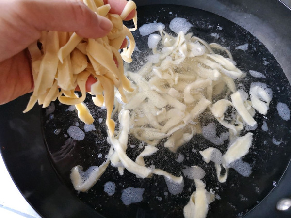 大火煮开,用漏勺沿锅边将面顺时针推起。