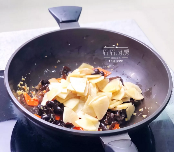锅中倒入泡发后的黑木耳和胡萝卜片